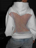 This bold and stylish hoodie redefines casual wear with bold, captivating style. Crafted from soft, heavyweight fabric, it offers ultimate comfort. Its open back, embellished with shimmering rhinestone mesh, creates a striking contrast to the relaxed silhouette. The oversized silhouette, dropped shoulders, and classic hood create a seamless blend of bold style and effortless streetwear flair.