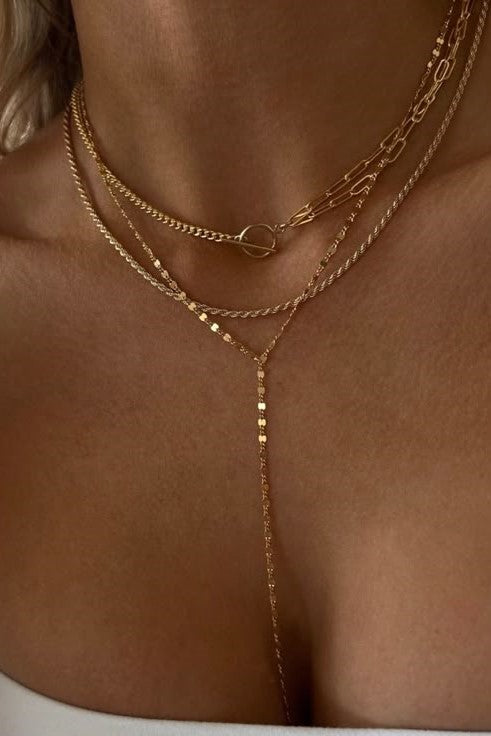A unique addition to your neckline, this necklace features a solid gold design and layered and a bar dangle detail.