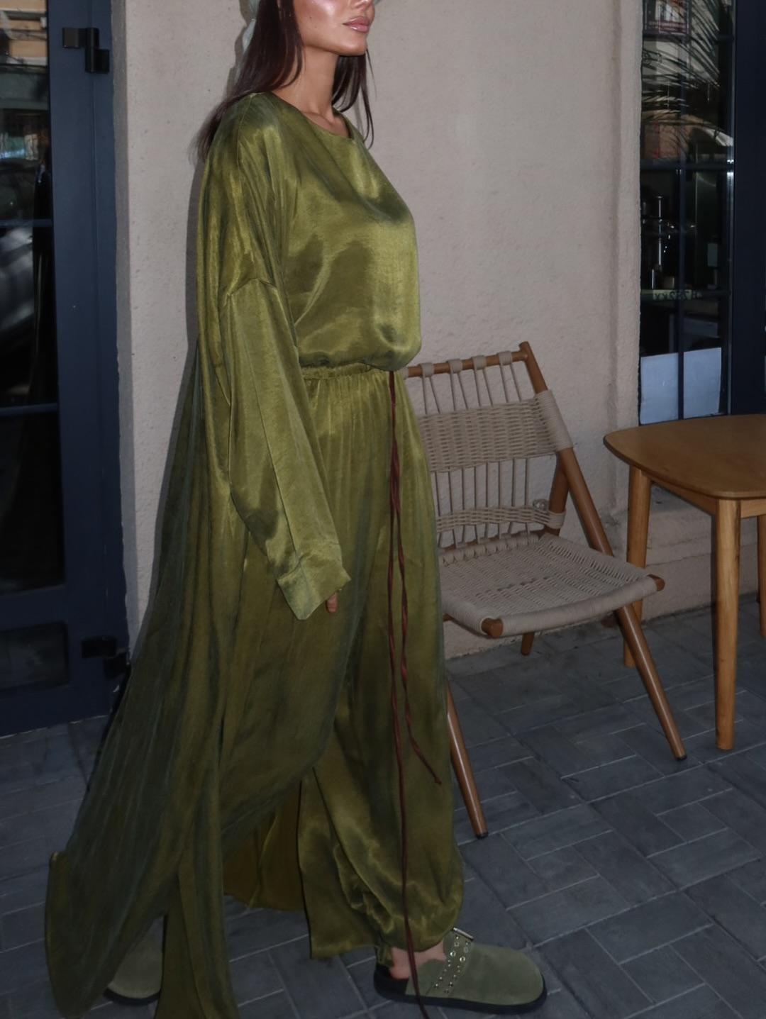The set includes a soft T-shirt for all-day comfort, fluid Aladdinki pants that bring a touch of bohemian charm, and a lightweight cape to layer with effortless grace. Crafted in breathable cupra fabric, each piece feels smooth against the skin while draping beautifully for a refined finish.