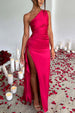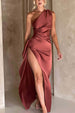 Our premium gown made from luxury, lightweight satin with a stretch to hug your curves. With draped detailing and one shoulder design, the maxi dress sweeps the floor and is complete with a thigh high split. Style yours with sleek hair, a mini bag and heeled mules.