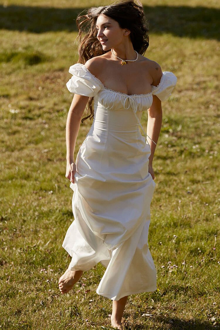 Tailored for an effortless and enchanting appeal, pretty white dresses for women are perfect for beach vacations and garden parties. This ethereal maxi sun dress in our boutique captures the essence of summer romance. The lace-timed square neck gathered with a bow tie at the middle center and delicate puffy short sleeves add a touch of sweetness, while the convenient back provides practicality alongside style. Crafted in a subtly sheer shade of pure white, this breezy floor-length sun dress is such a chic off-duty outfit for sunny days, radiating elegance and capturing the carefree spirit of the season.