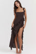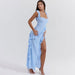 Turn heads in this flowy sun dress, crafted from lightweight polyester, with a classic square neckline, playful flouoncy-trimmed shoulder straps, and an alluring open-back design. The chiffon fabric offers a flowing, airy feel. Asymmetrical ruffles cascade down the bodice and high-slit skirt, adding movement and femininity. With a curve-hugging silhouette and discreet side zipper for a seamless fit, this unique sleeveless dress is perfect for weddings, parties, or formal events. Available in a variety of striking colors to suit your style.