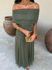 Romantic and effortless, the Toledo Dress captures the charm of sun-drenched days and moonlit strolls. Designed with a straight neckline and off-shoulder silhouette, it features a softly draped bodice and a flowing chiffon maxi dress that moves with grace.