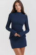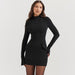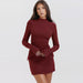 This minimalist mini dress blends sophistication with a modern edge, making it perfect for both professional settings and stylish evenings out. Featuring a high mock neck and a fitted silhouette, it flatters your figure while exuding confidence. The long sleeves have unique flared cuffs, adding an elegant retro touch. Faux flap pockets enhance the contemporary design, adding visual interest. A hidden back zipper ensures a seamless fit. Available in black, navy, and burgundy, this versatile jersey mini dress transitions effortlessly from office to date nights, parties, or special occasions in autumn and winter.