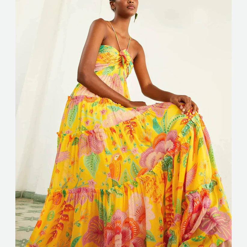 Details: Dreamy and modern all at once; the Vibrant Yellow Floral Halter Maxi Dress is a timeless standout.